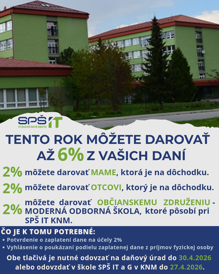 Vážení rodičia, žiadame Vás o ústretovosť z Vašej strany a aj v tomto roku Vás prosíme o darovanie 2% z dane nášmu občianskemu združeniu Moderná odborná škola. V roku 2026 môžete 2% darovať svojim rodičom a zároveň aj občianskemu združeniu. Ďakujeme..